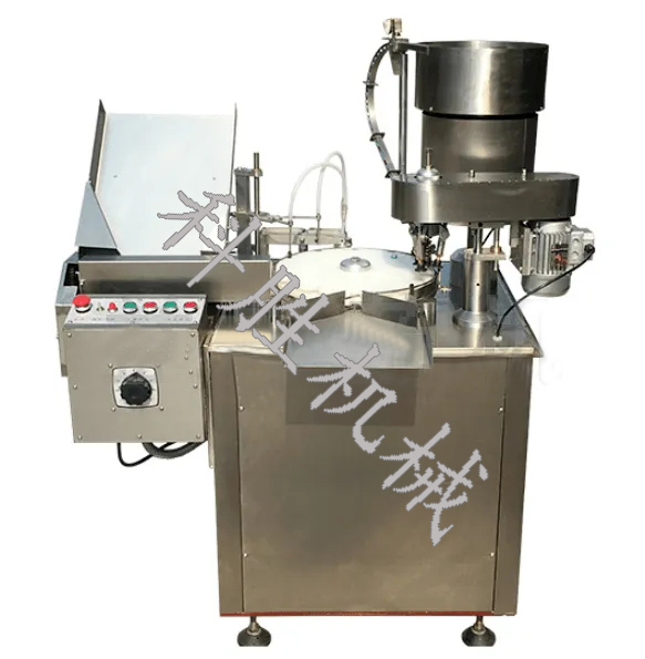 全自动口服液灌装旋盖机,适用于产品小剂量的酊水、口服液、糖酱的灌装,全机完成理瓶、输瓶、定量灌装、理盖、送盖、旋盖,与产品接触的零部件均采用316L不锈钢或PTFE制造,具有无瓶不灌装,变频调速等。